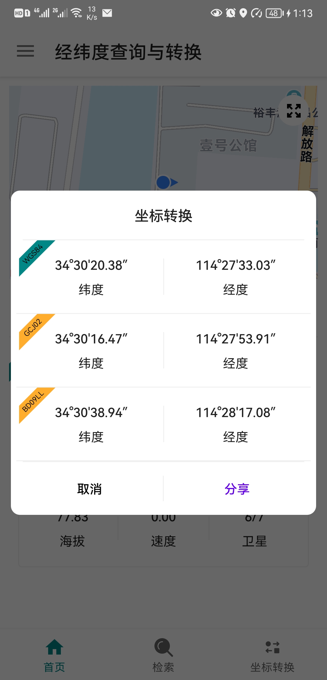 经纬度查询与转换是一款安全、免费的工具类应用软件,可为您提供位置信息查看、坐标信息浏览及原始坐标转换等相关的应用(或服务)。 主要功能: 1.查看坐标、海拔、地址、速度、卫星实时位置及可用数量; 2.支持速度及视图浏览功能; 3.支持查询卫星详细数据及视图浏览功能; 4.支持原始坐标系转换百度、高德坐标系功能; 5.支持excel文件传入批量转换坐标系功能; 6.支持查新海拔信息; 7.支持地址信息和地理坐标之间的相互转换; 8.支持一键分享,快速分享您的查询、转换数据。